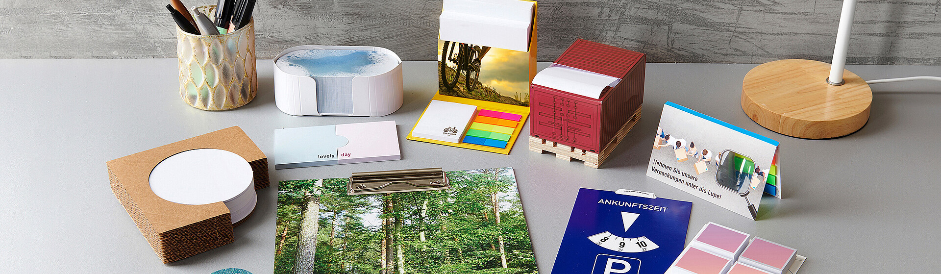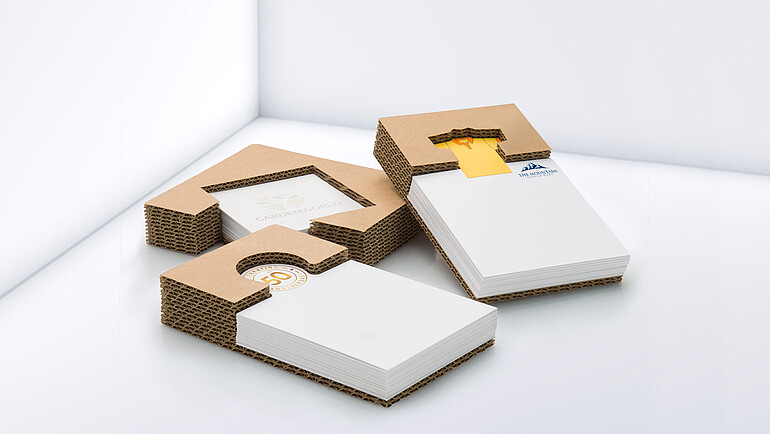 Nasze ulubione produkty przylepne oferujemy również jako konstrukcyjne wersje specjalne. Gdy mowa o materiale, uszlachetnieniach, kształtach, rozmiarach i liczbie kartek – praktycznie wszystko da się zrealizować. Szczególnie skuteczne są np. imitacje produktów lub efektowne osłony. Różne produkty przylepne jak karteczki lub markery samoprzylepne można dodatkowo połączyć np. z notesem.