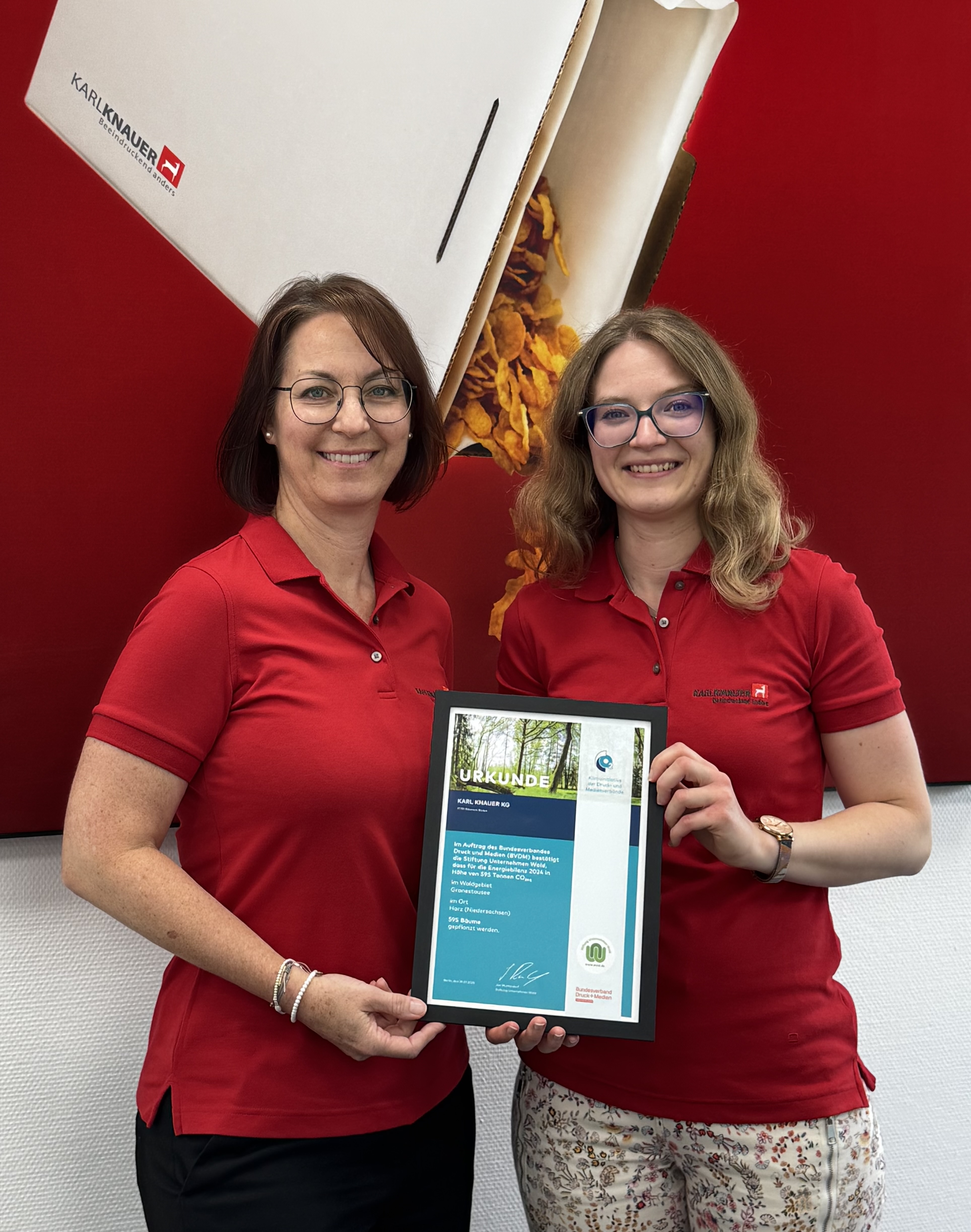 Na zlecenie Niemieckiego Związku Przemysłu Poligraficznego i Medialnego (bvdm) fundacja Stiftung Unternehmen Wald potwierdza, że poprzez posadzenie prawie 600 drzew w rejonie leśnym Granestausee w Harzu w Dolnej Saksonii zostanie dokonana darowizna klimatyczna, która zrównoważy emisję CO₂ z roku 2024. To działanie wnosi cenny wkład w stabilizację lokalnego klimatu oraz we wzmocnienie zasobów leśnych Niemiec.