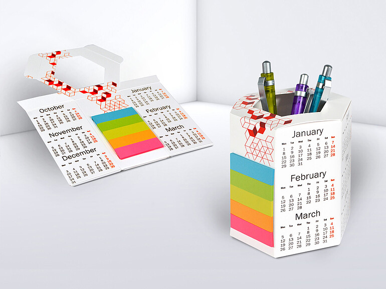 Jednak ten innowacyjny, wszechstronny produkt do codziennego użytku biurowego nie zawiera żadnych plakatów, a jest dookoła zadrukowany kalendarzem. Wystarczy lekki obrót, aby zawsze mieć cały rok w zasięgu wzroku. Kolorowy zestaw markerów jest zintegrowany z pudełkiem, które – podobnie jak cały organizer – jest wykonane w 100% z ekologicznego papieru i tektury. Wnętrze sprytnie zaprojektowanego przybornika biurowego, który można złożyć na płasko i wygodnie wysłać, oferuje mnóstwo miejsca na długopisy, linijki, nożyczki i inne przybory.