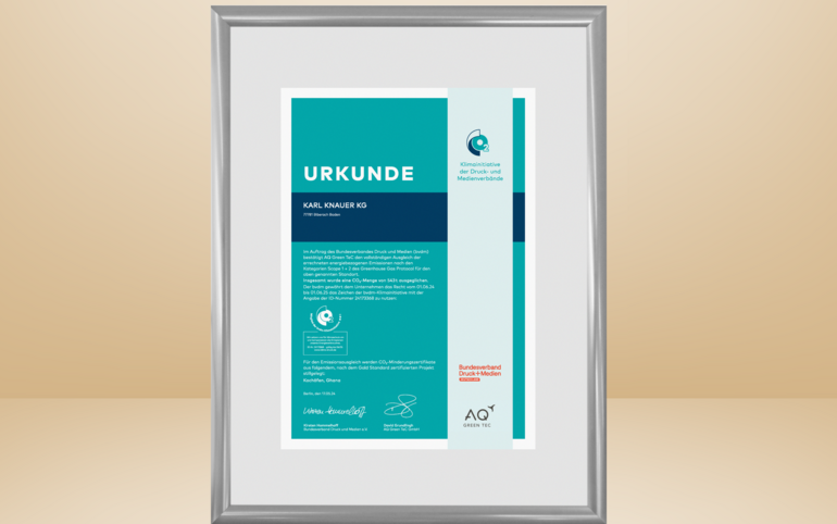Dzięki ciągłemu wsparciu takich projektów, Karl Knauer pozostaje aktywnym członkiem inicjatywy klimatycznej Niemieckiej Federacji Przemysłu Drukarskiego i Medialnego (bvdm) i daje silny przykład dla produkcji neutralnej pod względem emisji CO2.