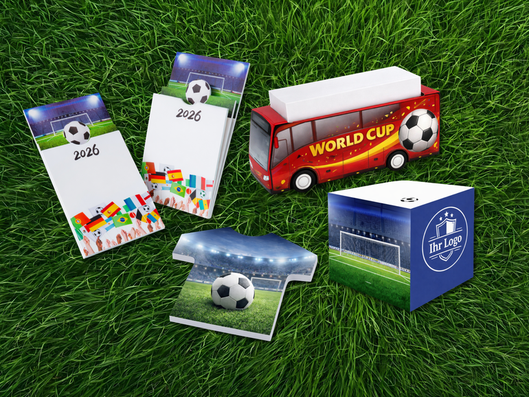 Firma Karl Knauer oferuje w tym celu kreatywne artykuły standardowe, które można indywidualnie zaprojektować zgodnie z identyfikacją wizualną firmy. Wycinane w kształcie karteczki samoprzylepne z materiału posiadającego certyfikat FSC – okrągłe jak piłka, koszulka, kciuk w górę lub serce – nadają biurku sportowy charakter. Drukowane w 4/0-kolorowym druku offsetowym w skali euro i dostępne w ilości od 500 sztuk, idealnie nadają się jako dodatek do mailingów, upominki targowe lub dodatki do akcji związanych z turniejem.
