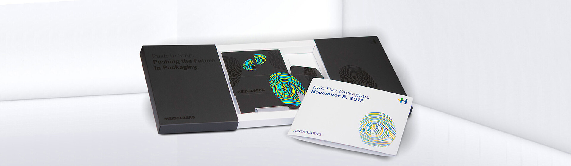 Trzyczęściowy mailing z okazji Info Day Packaging – przyszłość nadruku opakowań powinna stać się tym, czego możemy doświadczyć. Futerał został uszlachetniony wysokiej jakości lakierem reliefowym i soft touch. Osłania on ulotkę z zaproszeniem oraz mniejszy, również uszlachetniony w najwyższej jakości kartonik, który czytelnik musi otworzyć, budzi ciekawość i kieruje uwagę na temat opakowania. Jako oferent kompleksowych usług zaprojektowaliśmy opakowanie mailingowe, wyprodukowaliśmy i w pełni skonfekcjonowaliśmy, wliczając w to osiem wersji językowych.